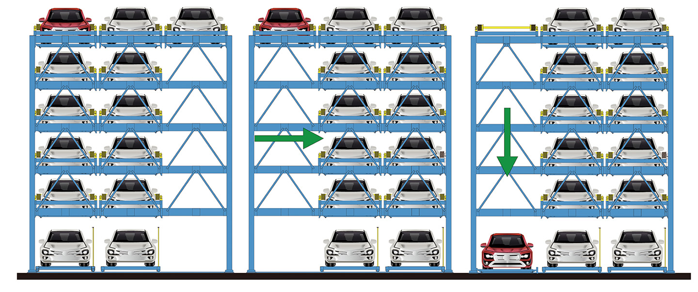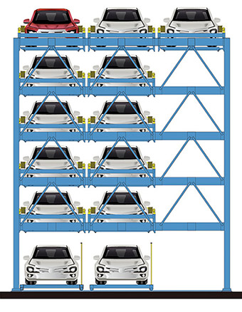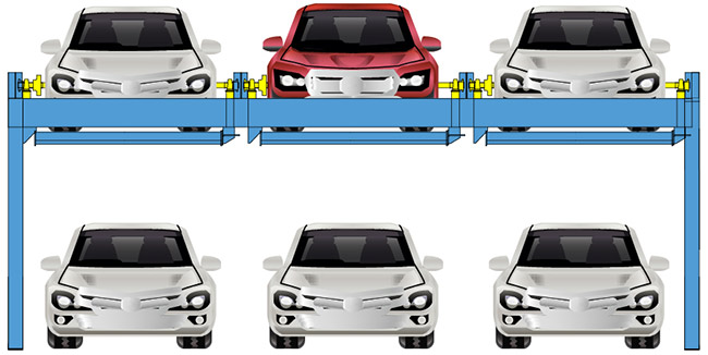 升降橫移式類停車設備工作時要留有交換車位,即空車位,其有效停車數量的計算并不是地面停車位數與層數的簡單疊加,通常把較大型的車庫劃分成若干個單元,一個單元只能按先、后一人進行存、取車的操作,不能兩人或多人同時進行。